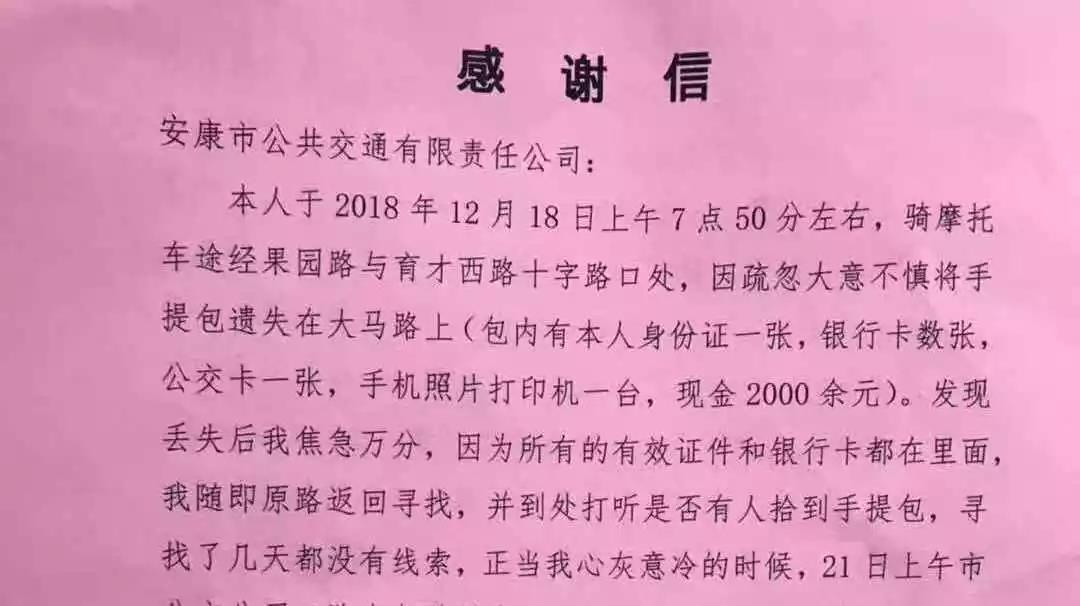 據(jù)失主吉某介紹,她是在12月18日早上的7點50分左右,騎摩托車途徑果園路與育才西路十字路口處,不慎將手提包遺失在馬路上。發(fā)現(xiàn)包丟失之后焦急萬分,隨即原路返回尋找,并四處打聽是否有人拾到手提包,尋找了幾天都沒有線索,正當(dāng)她心灰意冷的時候,接到了李師傅的電話。兩人確認后,當(dāng)天下午,失主吉某來到安康市公交公司領(lǐng)取自己遺失的手提包。并將一面印有“拾金不昧品德高尚”的錦旗和一封感謝信送到公交公司車隊辦公室。